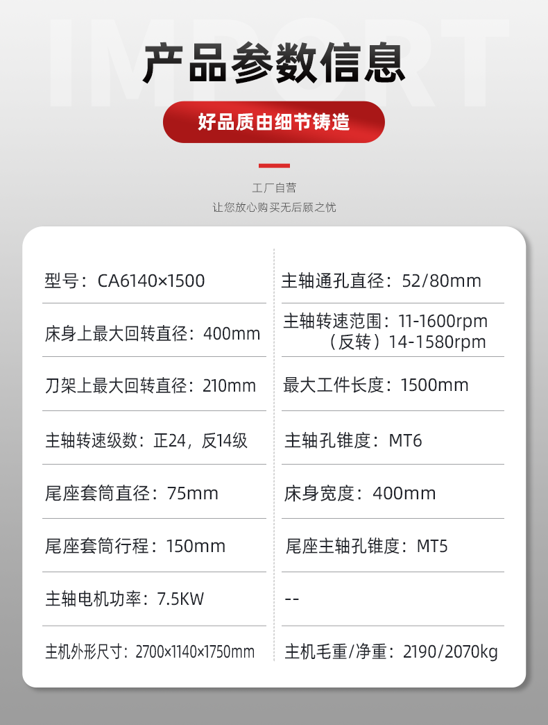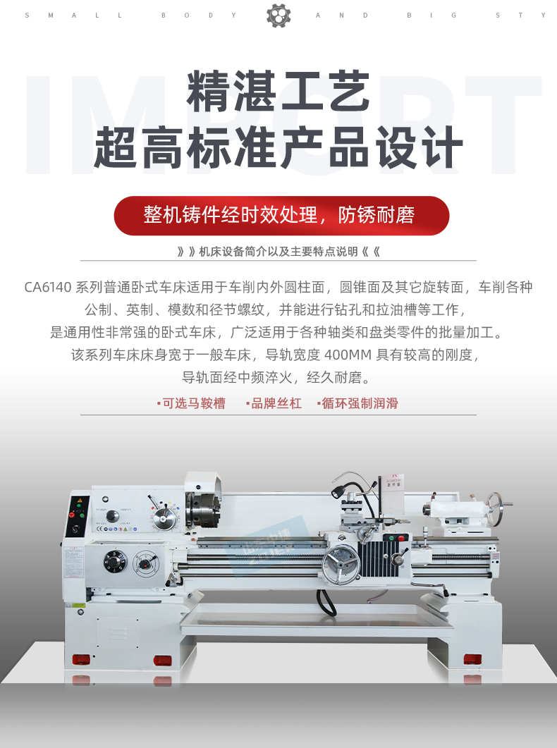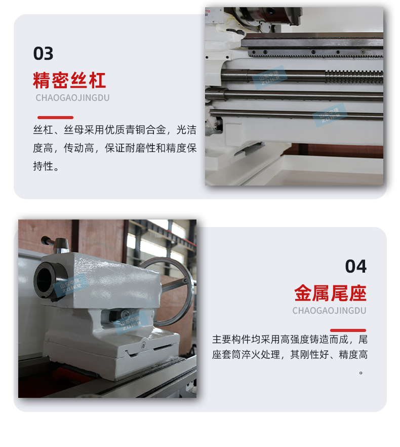 该系列车床床身宽于一般车床,导轨宽度400mm具有较高的刚度,导轨面经中频淬火,经久耐磨。