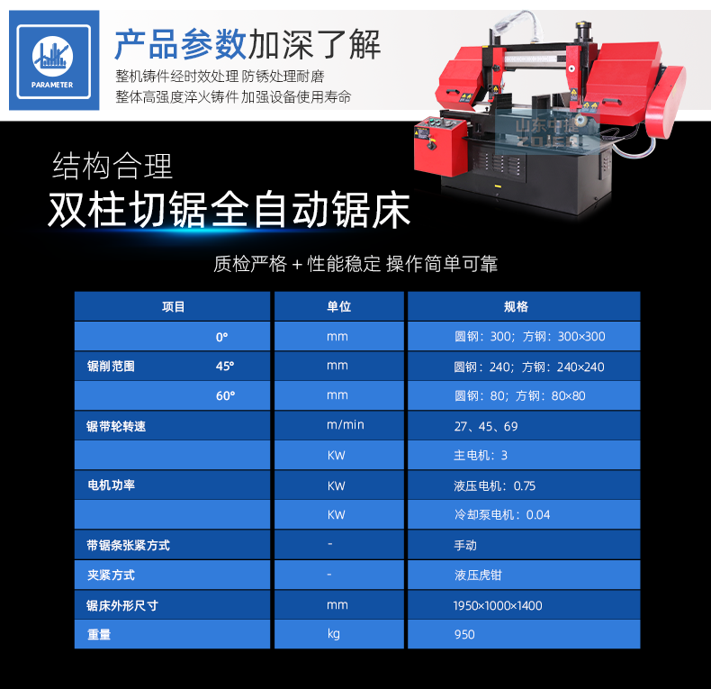 角度带锯床可调0-45度。本机床应用于切割钢胚、铁板、无缝钢管及大型轴类零件,亦可在选取适当的工艺参数后,切割各 种黑色或有色金属材料。具有可靠性高、效率高和高刚性等显著特点。