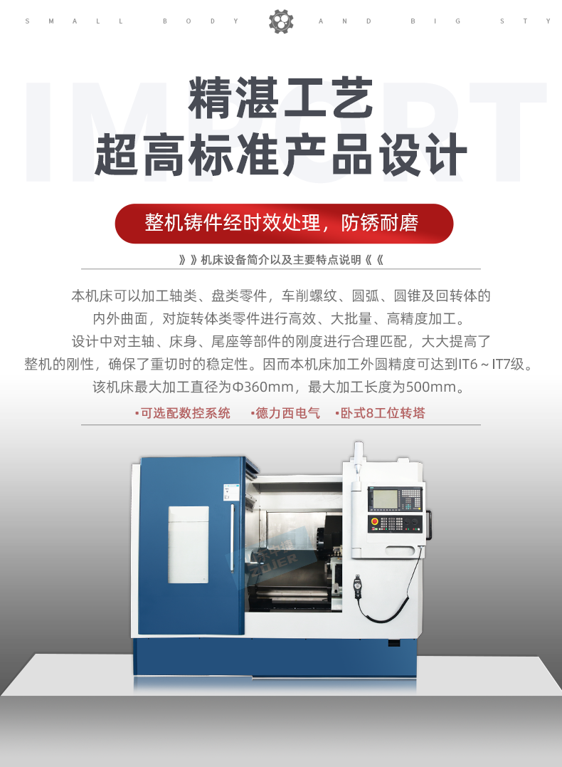 TCK50系列数控卧式车床是结合我厂多年设计卧式数控卧式车床的经验,顺应市场及发展需求而设计、生产的一种高品质产品。该机床最大加工直径为φ360mm,最大加工长度为500mm,全新设计的主机结构及可靠的装配工艺使TCK50系列机床获得了全面升级,稳定可靠的产品性能加上创新的人机工程学设计,TCK50系列无疑将成为行业内的佼佼者。